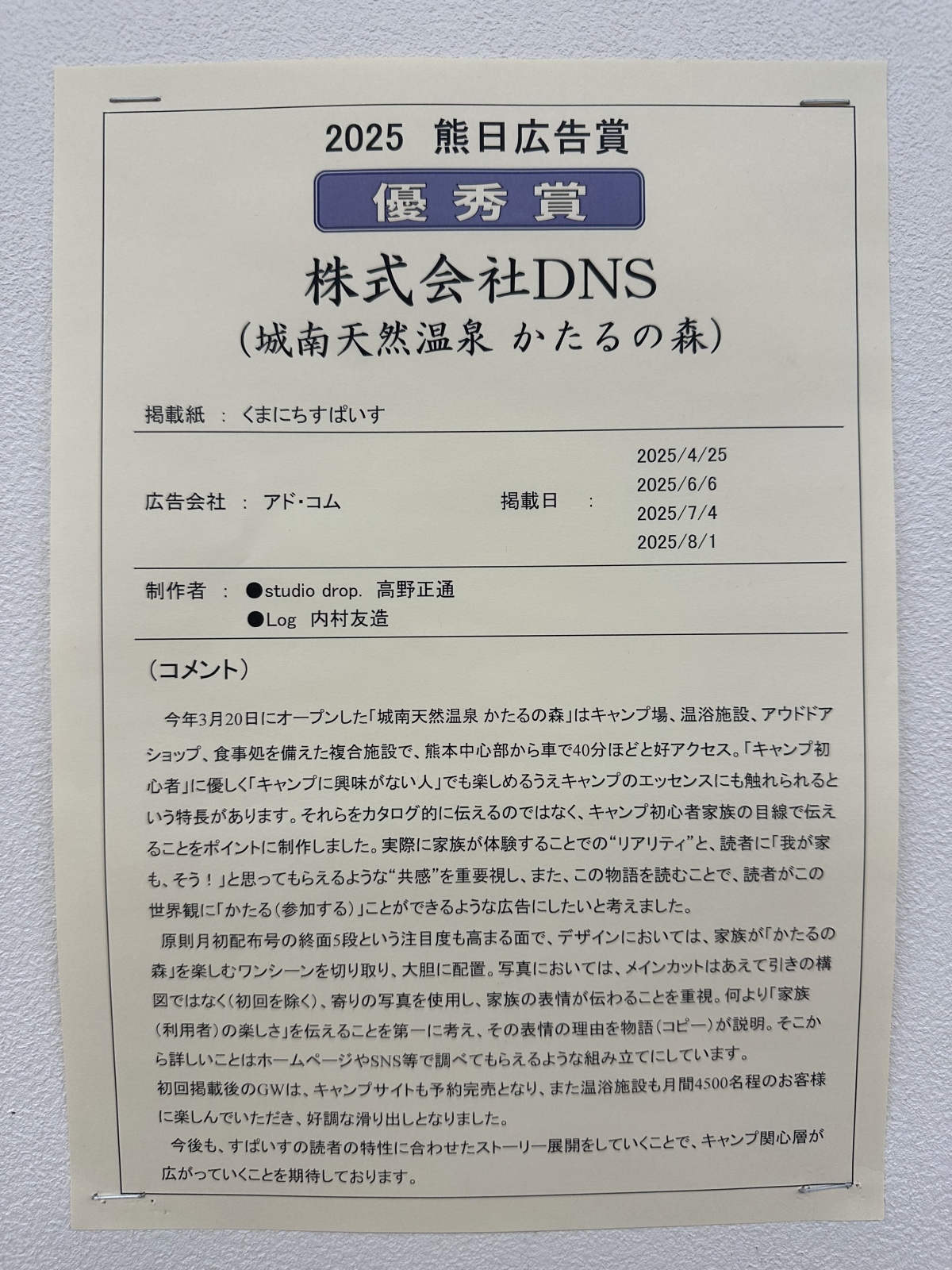 2025熊日広告賞 優秀賞に選ばれました 2025/10/10 企業情報 2025熊日広告賞 優秀賞に選ばれました ドゥ.ヨネザワ企業グループ 株式会社アド・コムが担当した 「城南天然温泉かたるの森」の広告が、2025熊日広告賞優秀賞に選ばれました! 本広告は、家族がかたるの森で過ごす様子がストーリー仕立てで描かれており「家族(利用者)の楽しさ」が伝わる内容となっています。 10月7日まで鶴屋百貨店にて展示され、多くの方にご覧いただきました。 かたるの森ホームページ