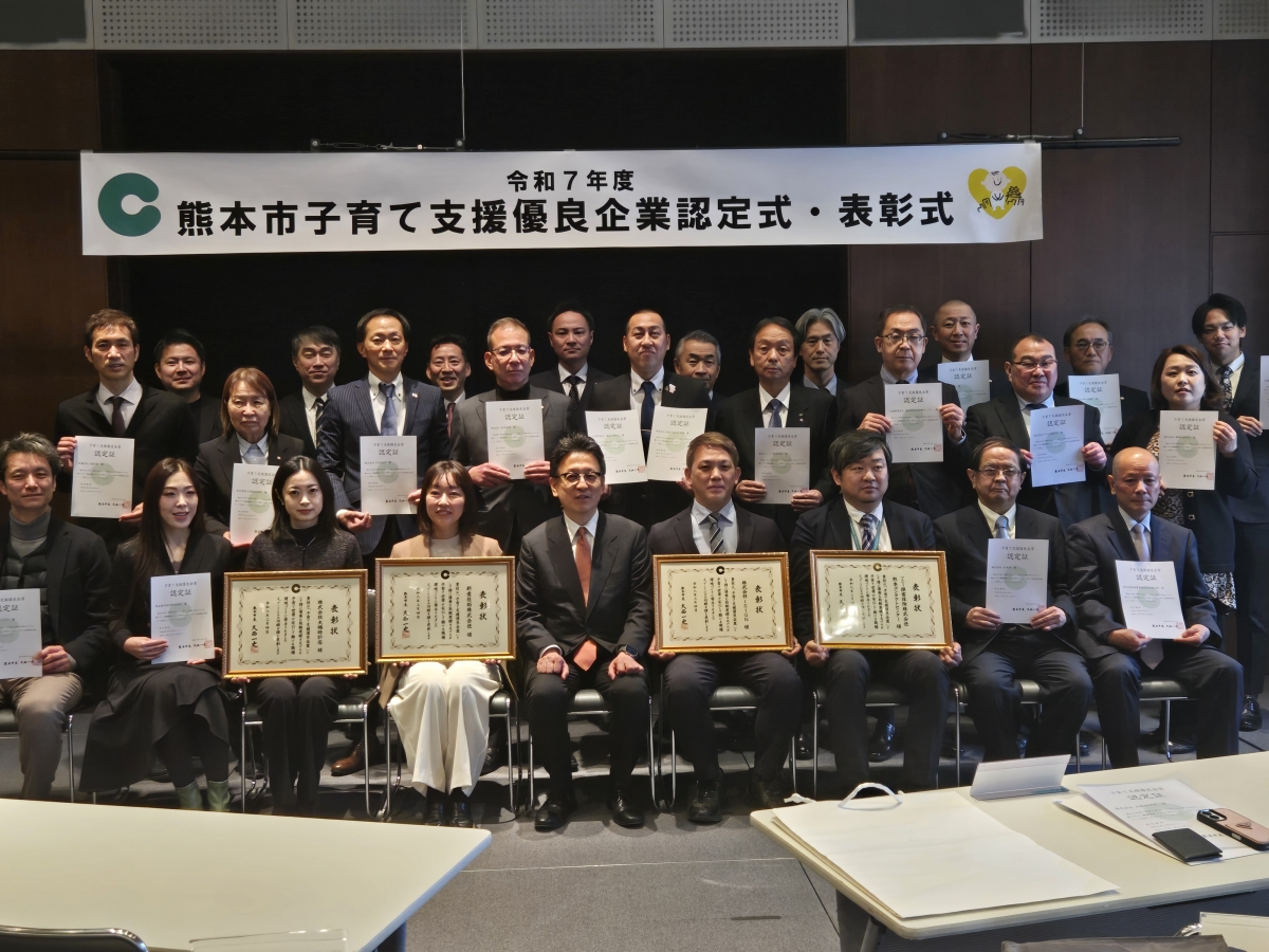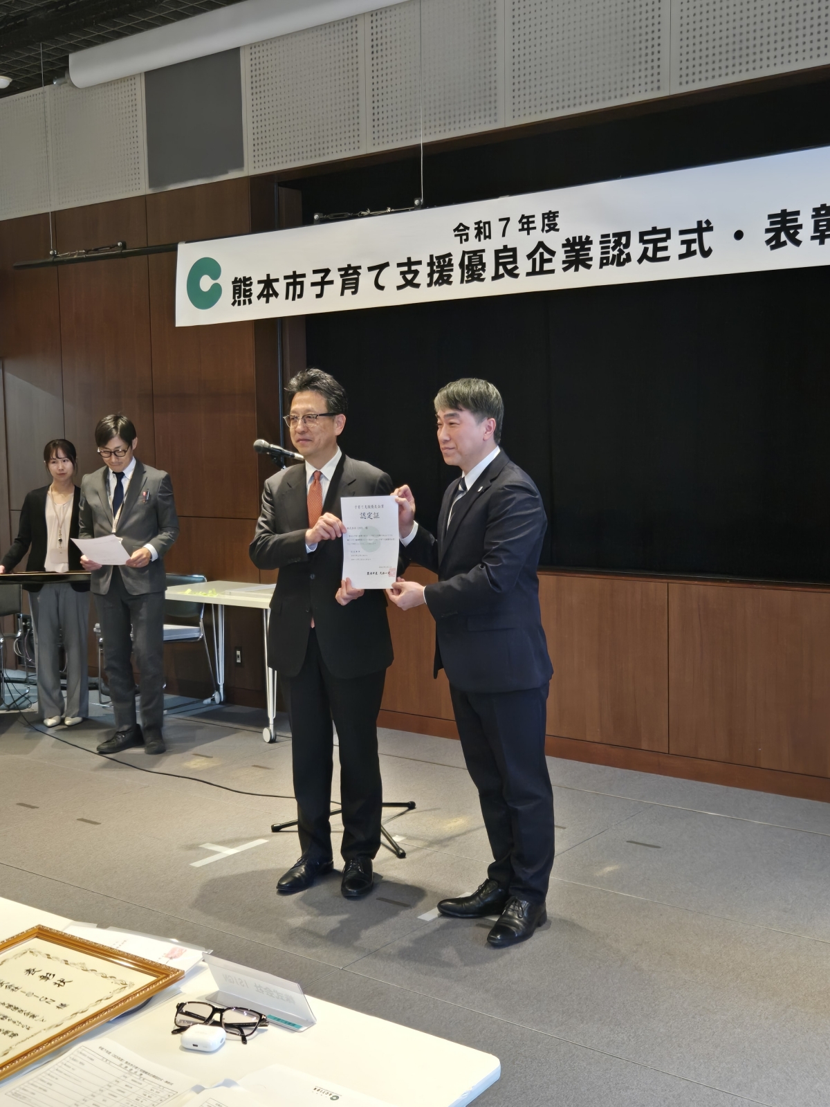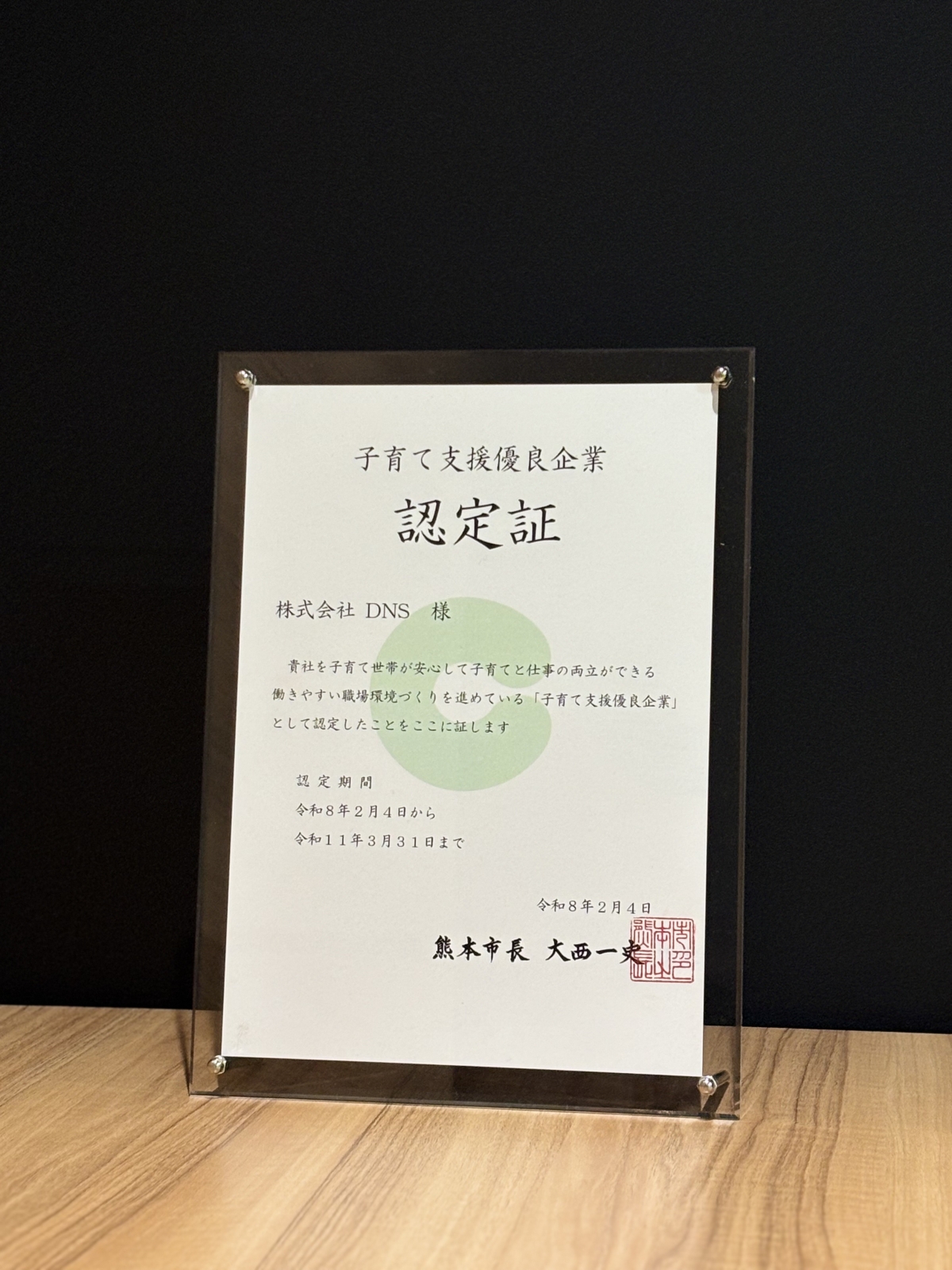 このたび株式会社DNSは、子育て世帯等が安心して子育てと仕事を両立できる、働きやすい職場環境づくりに取り組む企業として、「令和7年度 熊本市子育て支援優良企業」の認定を受けました。